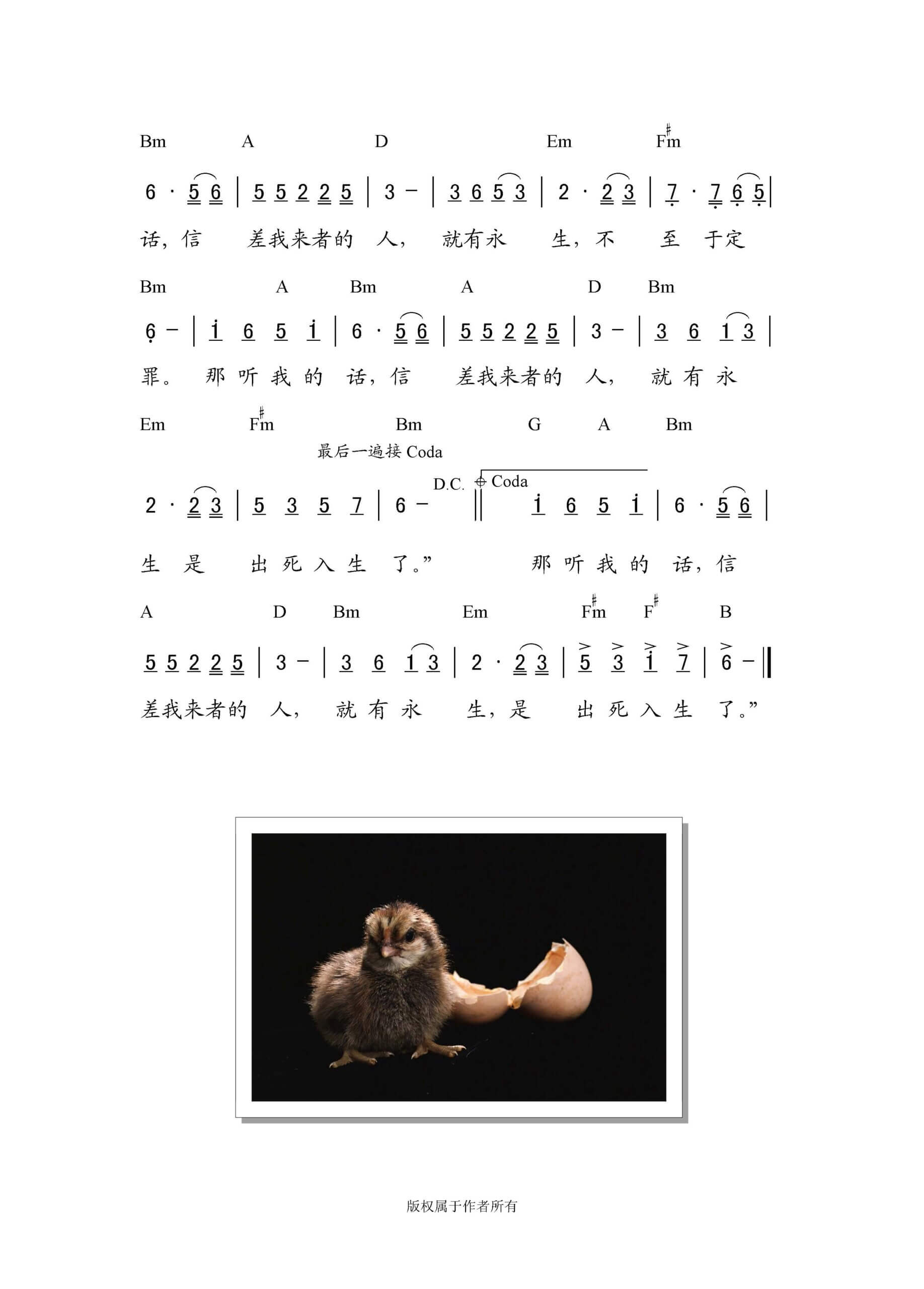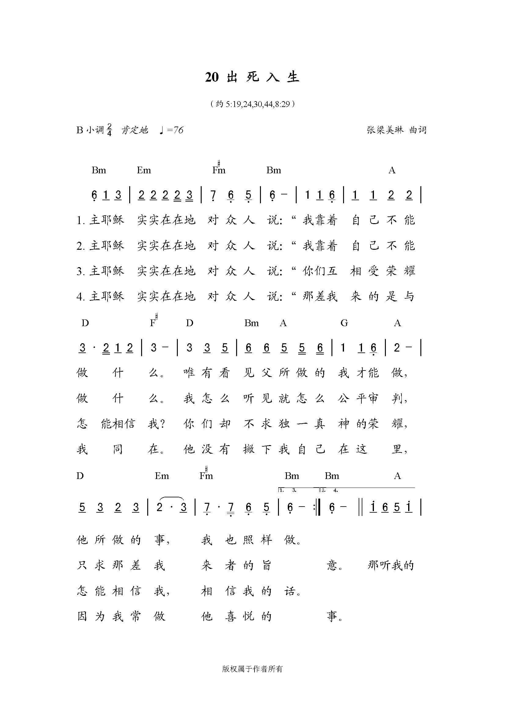 https://xiangbaishu.site/wp-content/uploads/2025/10/出死入生.mp3出死入生作词/作曲:张梁美琳 主耶稣实实在在地对众人说我靠着自己不能做什么唯有看见父所做的我才能做他所做的事 我也照样做主耶稣实实在在地对众人说我靠着自己不能做什么我怎么听见就怎么公平审判只求那差我来者的旨意*主耶稣实实在在地对众人说你们互相受荣耀怎能相信我你们却不求独一真神的荣耀怎能相信我 相信我的话主耶稣实实在在地对众人说那差我来的是与我同在他没有撇下我自己在这里因为我常做他喜悦的事**副歌:那听我的话 信差我来者的人就有永生不至于定罪那听我的话 信差我来者的人就有永生是出死入生了 †耶稣对他们说:“我实实在在地告诉你们,子凭着自己不能做什么,惟有看见父所做的,子才能做;父所做的事,子也照样做。……我实实在在地告诉你们,那听我话、又信差我来者的,就有永生;不至于定罪,是已经出死入生了。……“我凭着自己不能做什么,我怎么听见就怎么审判。我的审判也是公平的;因为我不求自己的意思,只求那差我来者的意思。”……你们互相受荣耀,却不求从独一之神来的荣耀,怎能信我呢?……那差我来的是与我同在;他没有撇下我独自在这里,因为我常做他所喜悦的事。”约翰福音 5:19,24,30,44 , 8:29 图片来自网络,如有侵权,请联系删除。 阅读更多 上一篇文章【诗歌】称谢你手所造的一切 下一篇文章【诗歌】爱的团聚 你可能也喜欢 【诗歌】完全的爱 2023年5月9日 【诗歌】Hi-Ne-Ni(我在这里) 2023年11月20日 【诗歌】爱里没有惧怕 2023年4月25日