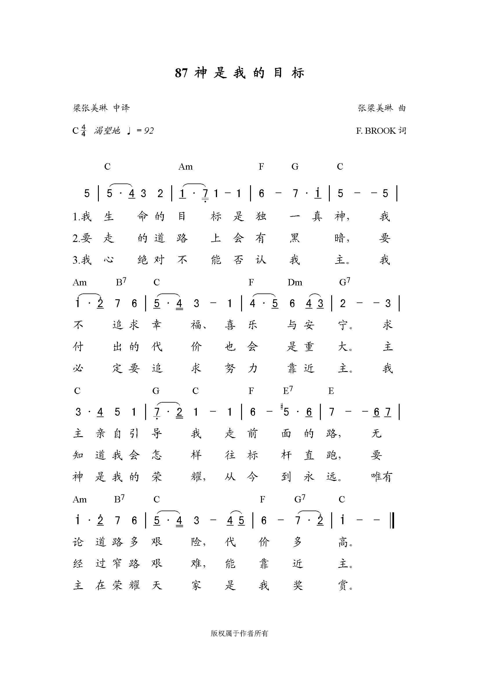 https://xiangbaishu.site/wp-content/uploads/2026/01/【诗歌】神是我的目标.mp3神是我的目标作词: F Brook作曲:张梁美琳 我生命的目标是独一真神我不追求幸福 喜乐与安宁求主亲自引导我走前面的路无论道路多艰险 代价多高要走的道路上会有黑暗要付出的代价也会是重大主知道我会怎样往标杆直跑要经过窄路艰难 能靠近主我心绝对不能否认我主我必定要追求努力靠近主我神是我的荣耀从今到永远唯有主在荣耀天家是我奖赏 † 图片来自网络,如有侵权,请联系删除。 阅读更多 上一篇文章【诗歌】求耶稣作我主 下一篇文章【诗歌】神的儿女 你可能也喜欢 【诗歌】同心同行 2023年5月9日 【诗歌】多结果子 2023年11月15日 【原创诗歌】更美的盼望 2024年6月5日